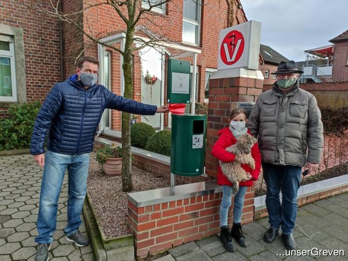 Markus Ahlert, stellvertretender Fraktionsvorsitzende ...unserGreven (links), Emily mit der Pudelmischung Emma und Tierarzt Uwe Lehmann.